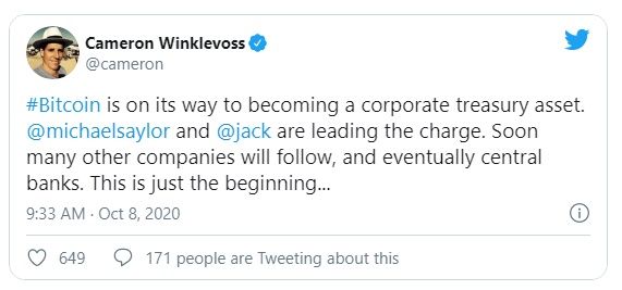 La medida marca el comienzo de lo que se perfila como una tendencia en las empresas estadounidenses, una que comenzó con Michael Saylor de MicroStrategy, cuya compañía ahora tiene Bitcoin como un activo de reserva del tesoro. Si bien no está claro si se extenderá “como un incendio forestal”, podría hacerlo. El director de Galaxy Digital, Michael Novogratz, elogió recientemente a Saylor por ser un pionero, y agregó que no pasaría mucho tiempo para las próximas adopciones.