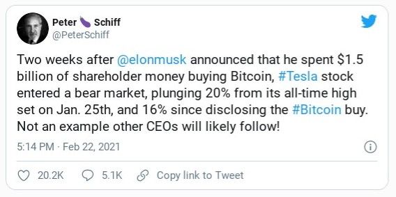 La caída también sigue a las respuestas de Musk a Peter Schiff, llamando al CEO de Tesla por etiquetar tanto a fiat como a Bitcoin como “BS”. En su opinión, Musk considera hablar de oro y poseerlo como dos cosas diferentes.