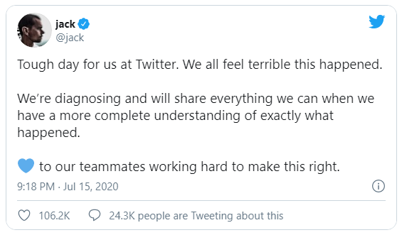 El CEO Jack Dorsey se refirió al incidente en un tuit el miércoles por la noche, calificándolo de “un día difícil para nosotros en Twitter”, y expresó: