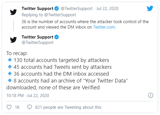 Twitter dijo en un comunicado el jueves que 130 cuentas fueron atacadas, aunque no todas estaban comprometidas.