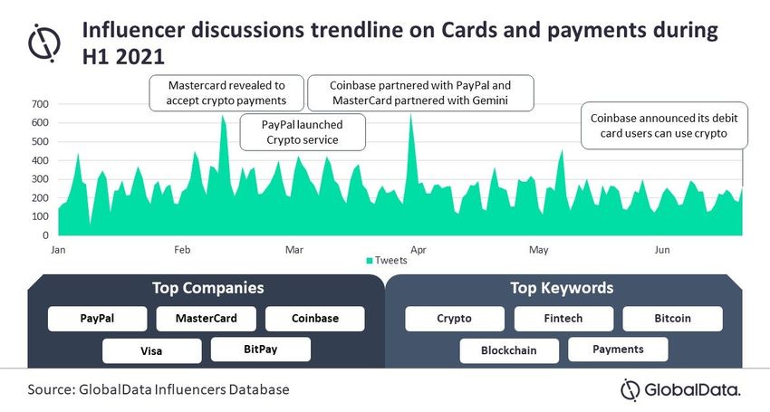 GlobalData sostiene que Paypal, Coinbase y Mastercard fueron las empresas que más tendencia generaron en Twitter cuando mencionaban métodos de pagos basados en criptomonedas.