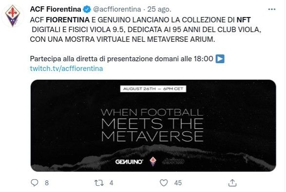 Fiorentina y Genuino Blockchain organizaron “Cuando el fútbol se encuentra con el metaverso”, la primera exhibición de la NFT dentro del espacio virtual Arium para celebrar el 95 aniversario del club a celebrarse el domingo 29 de agosto.