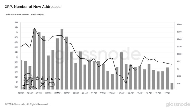 “¡La [actividad de la] red #XRP ha estado disminuyendo durante el último mes! Las direcciones nuevas se han reducido de 5,200 a tan solo 2,900”, expuso el analista Ali Martínez en X.