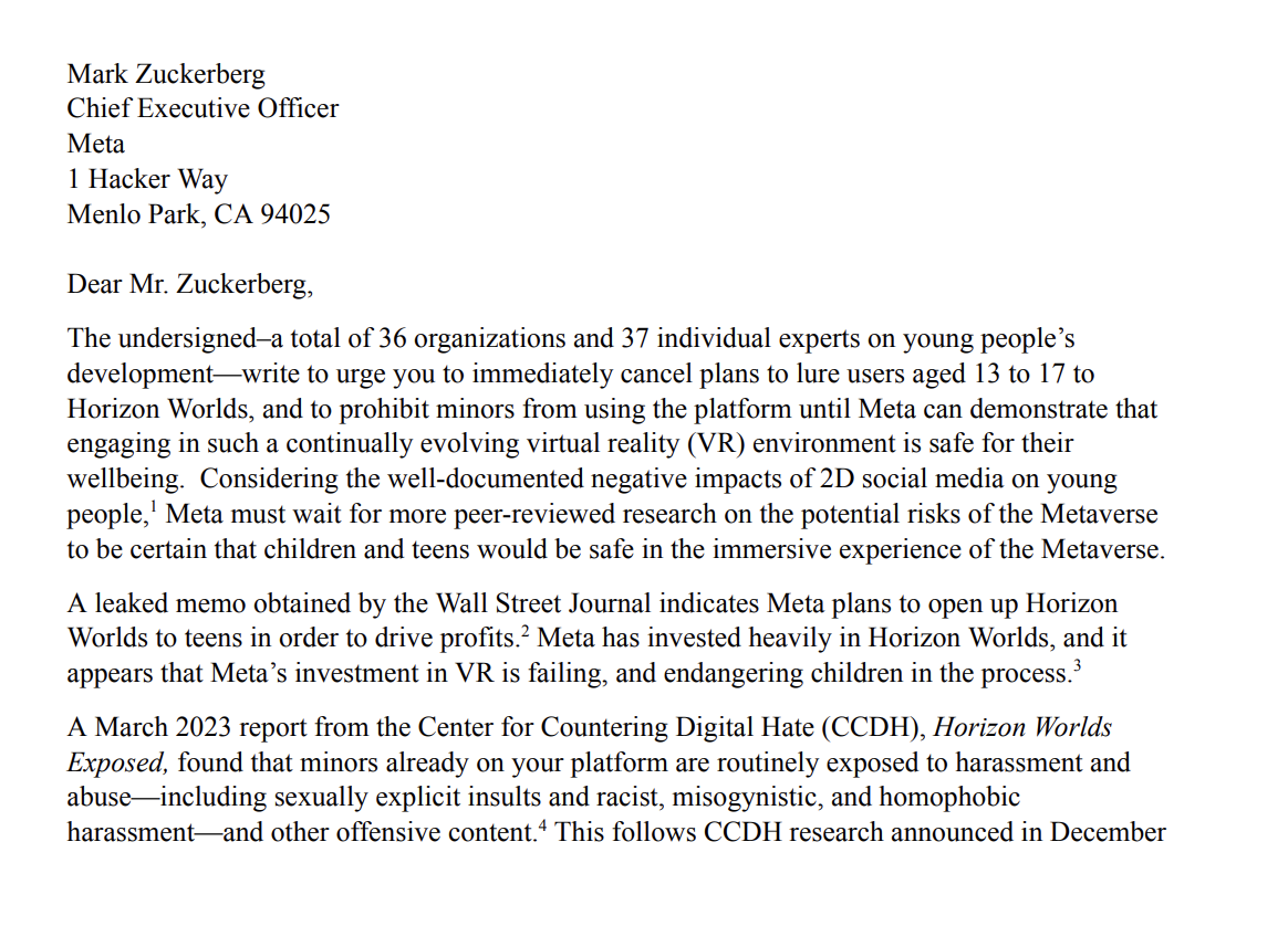 De acuerdo al documento firmado por 36 organizaciones y 37 expertos, el metaverso es dañino para niños y adolescentes. La afirmación se realiza citando una investigación de marzo de 2023 realizada por el CCDH que reveló que los menores pueden ser expuestos rutinariamente a acoso y abuso, incluidos insultos sexualmente explícitos e insultos racistas, misóginos y homofóbicos.