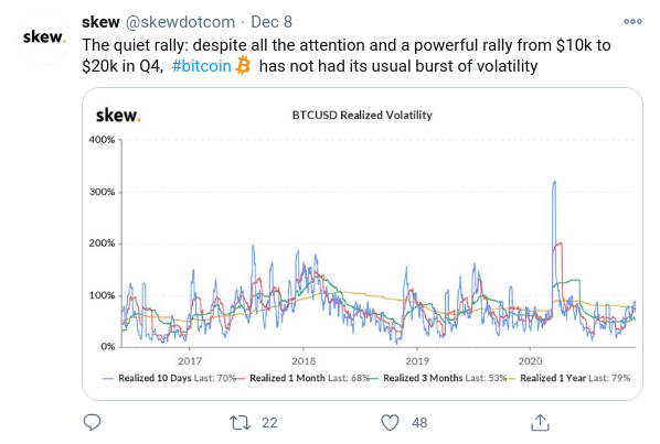 Según los datos proporcionados por Skew, Bitcoin no ha visto el nivel de volatilidad que se ha visto en carreras alcistas anteriores a pesar del aumento en el valor por BTC.