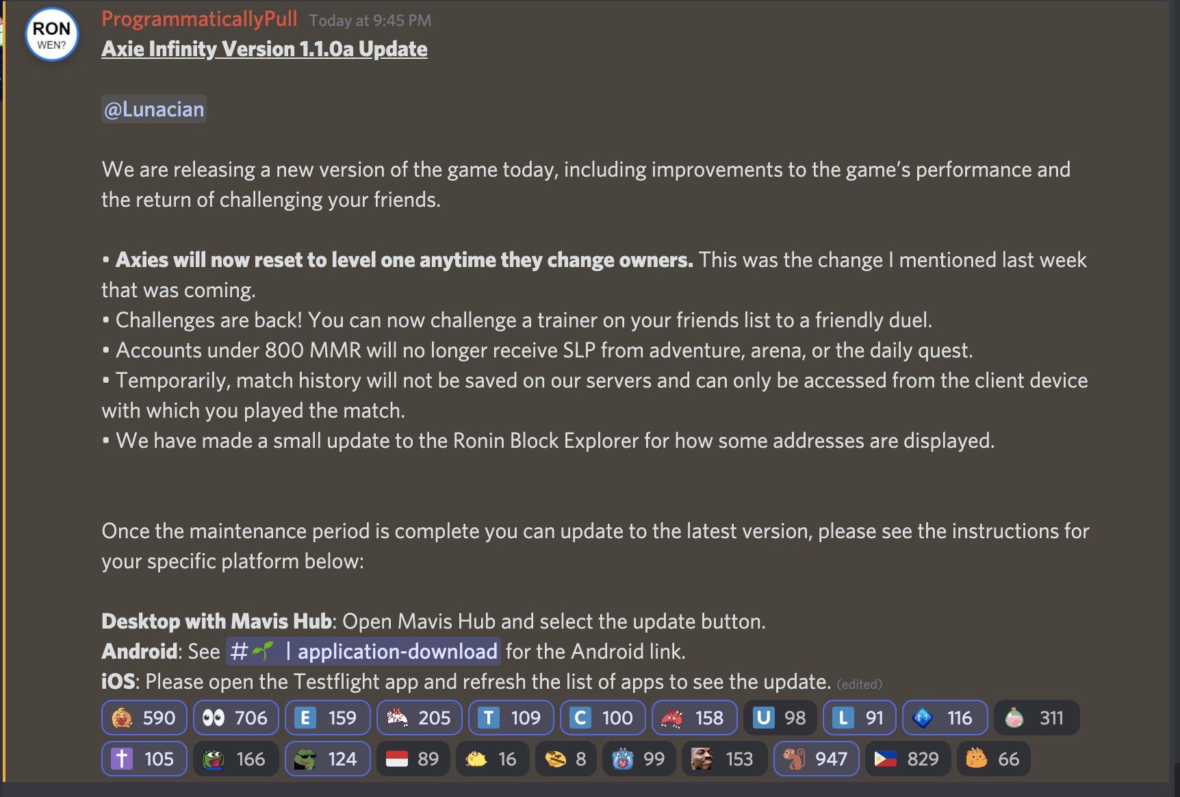 El equipo desarrollador del popular videojuego Axie Infinity anunció las características de la nueva actualización 1.1.0a. Entre los detalles más importantes se destaca que los jugadores con 800 MMR o menos ya no recibirán tokens SLP, decisión que ha provocado reacciones adversas por parte de la comunidad.
