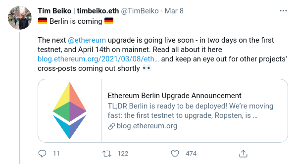 Tim Beiko, el desarrollador principal, ha puesto a la comunidad al día sobre Berlin, la próxima actualización del protocolo de red Ethereum. El lanzamiento a la red principal está programado para el 14 de abril.