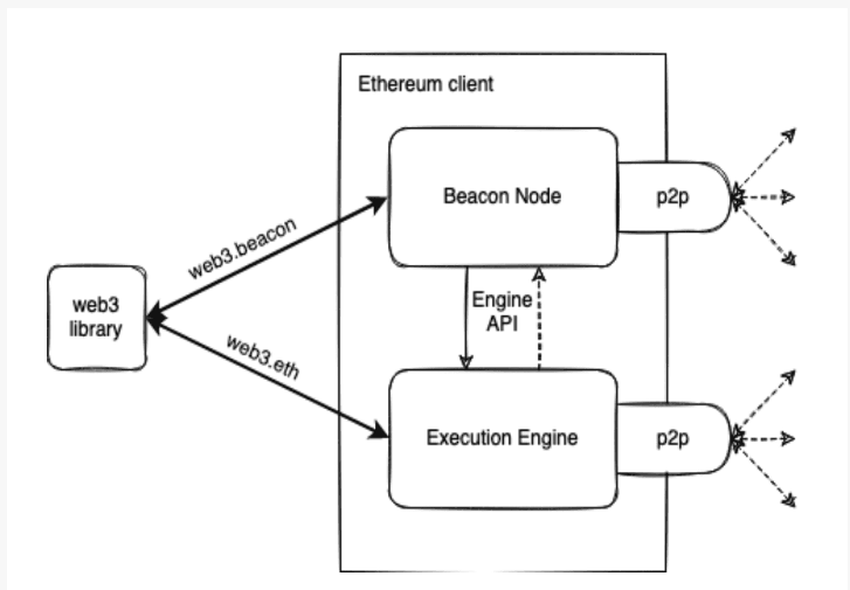 Sponsored SponsoredDespués de la Fusión, cada nodo ejecuta un consenso y un cliente de ejecución. El cliente de ejecución realiza transacciones en la Ethereum Virtual Machine (EVM), mientras que el cliente de consenso permite que la red llegue a un acuerdo basado en los datos de transacción procesados del cliente de ejecución.