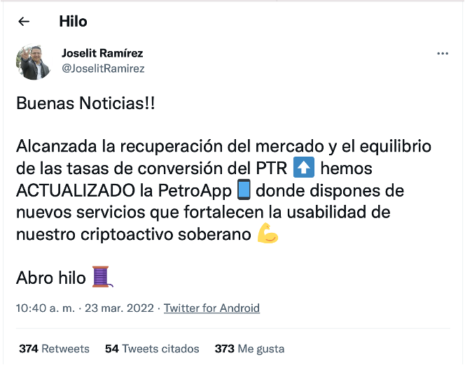 Joselit Ramirez, Superintendente nacional de criptoactivos en Venezuela, ha anunciado en su cuenta de Twitter, que ya es posible realizar múltiples operaciones comerciales en Venezuela utilizando la plataforma de pago PetroApp, la cual utiliza principalmente el token estatal Petro.