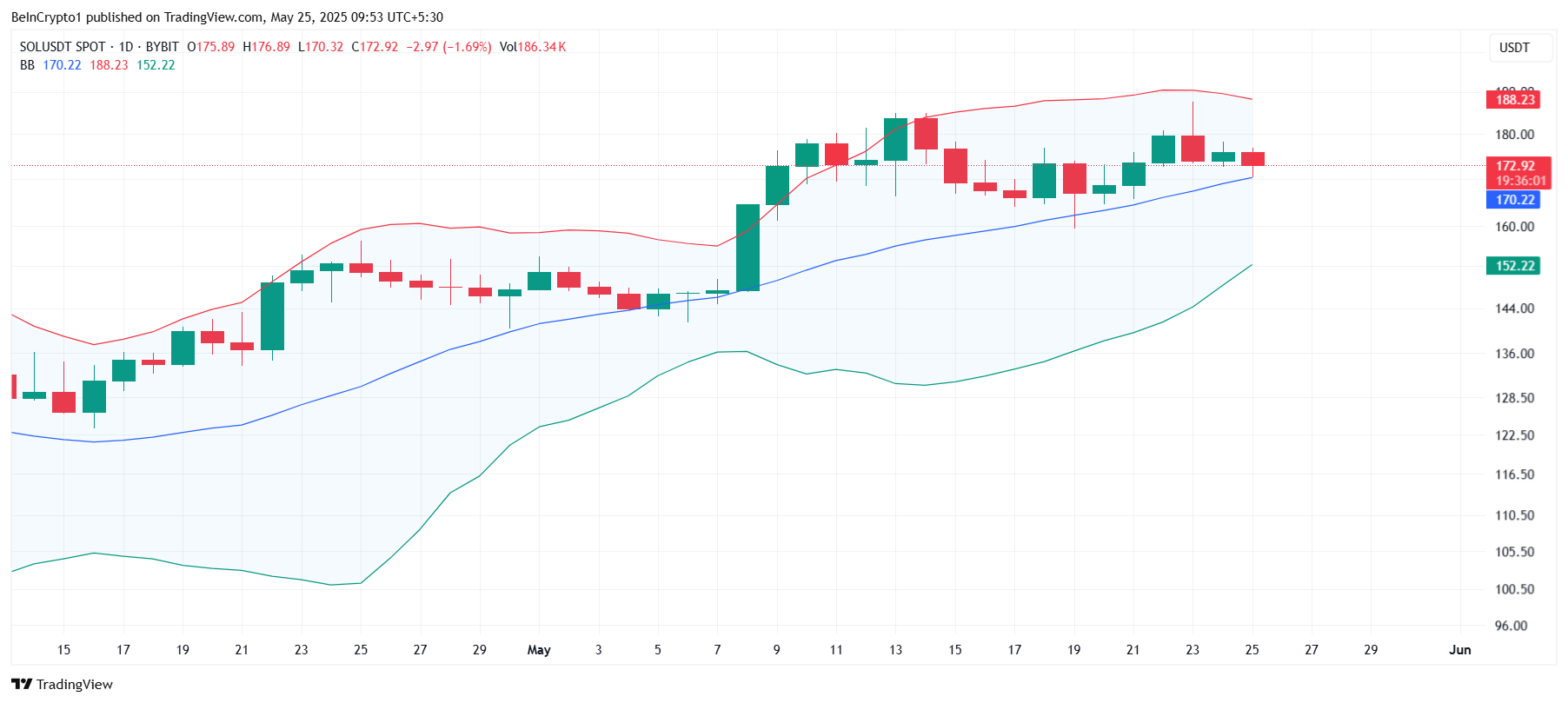 El precio de Solana se ha movido lateralmente durante gran parte de mayo, probablemente debido al sobrecalentamiento del token en las semanas anteriores. Sin embargo, este período de enfriamiento podría crear una oportunidad para un movimiento alcista.