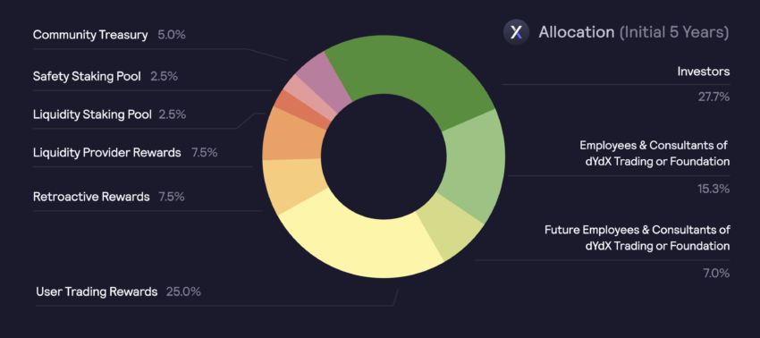 Parte de la asignación inicial se reservó para inversores anteriores de dYdX Trading Inc. (27,7 %), fundadores, empleados, asesores y consultores de dYdX Trading Inc. y dYdX Foundation (15,3 %) y futuros empleados y consultores de dYdX Trading Inc. y Fundación dYdX (7,0%).