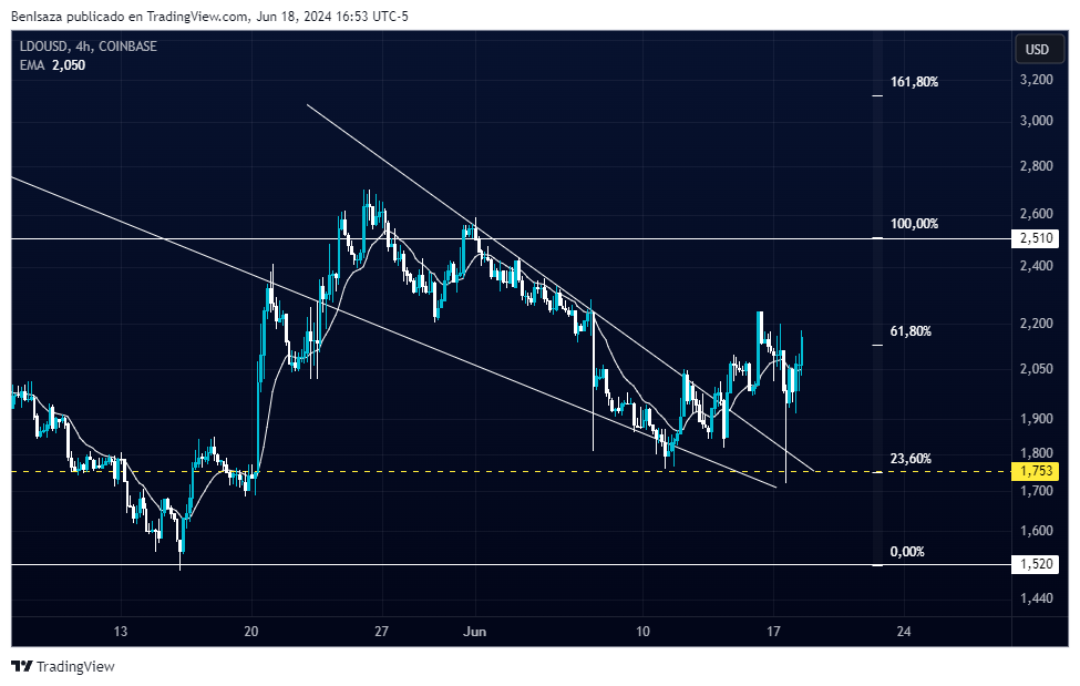 El par LDO/USD, ha sido uno de los pocos tokens alcistas, recuperando cerca de un 30% en el valor de su cotización. El área de mayor liquidez y con buena de reacción de precios se ubica sobre el nivel de los 1.7 dólares.