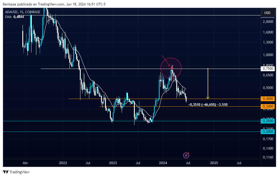 SponsoredEn este sentido, Cardano cumple más de 15 semanas de retroceso. El obstáculo más próximo se ubica en la región de los 0.4 dólares y 0.34 dólares.
