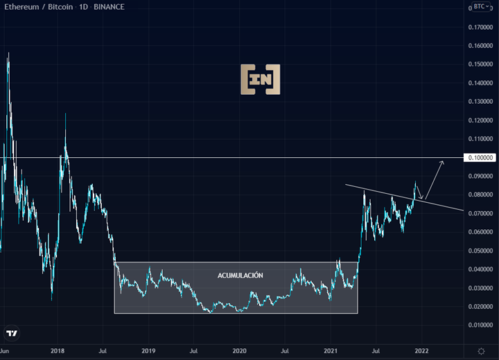 También cabe recalcar que ETH contra el par BTC ha venido teniendo un largo lapso de acumulación entre 2019 y 2020, lo que proyectaría a ETH continuar dentro de un patrón ascendente.