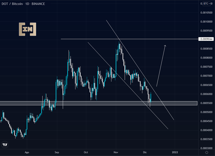 DOT presenta el patrón chartista “cuña descendente”. El área de soporte ubicado en los 0.00055 BTC se podría considerar una pauta de inversión, debido a que el rango de caída indica que la tendencia descendente está perdiendo fuerza.