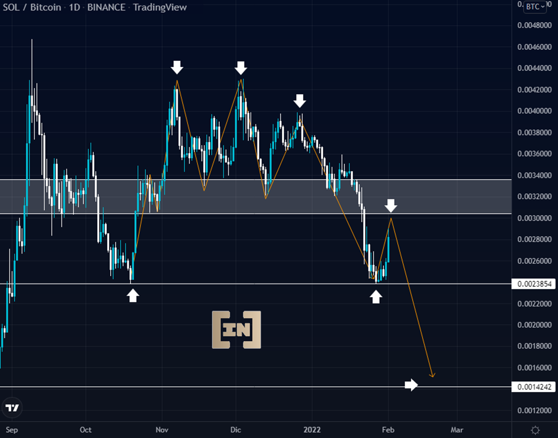 Sin embargo, como también se aprecia en el gráfico, SOL puede presentar un gran impulso bajista que lo lleve a ubicarse sobre el soporte de los 0.0014 BTC.