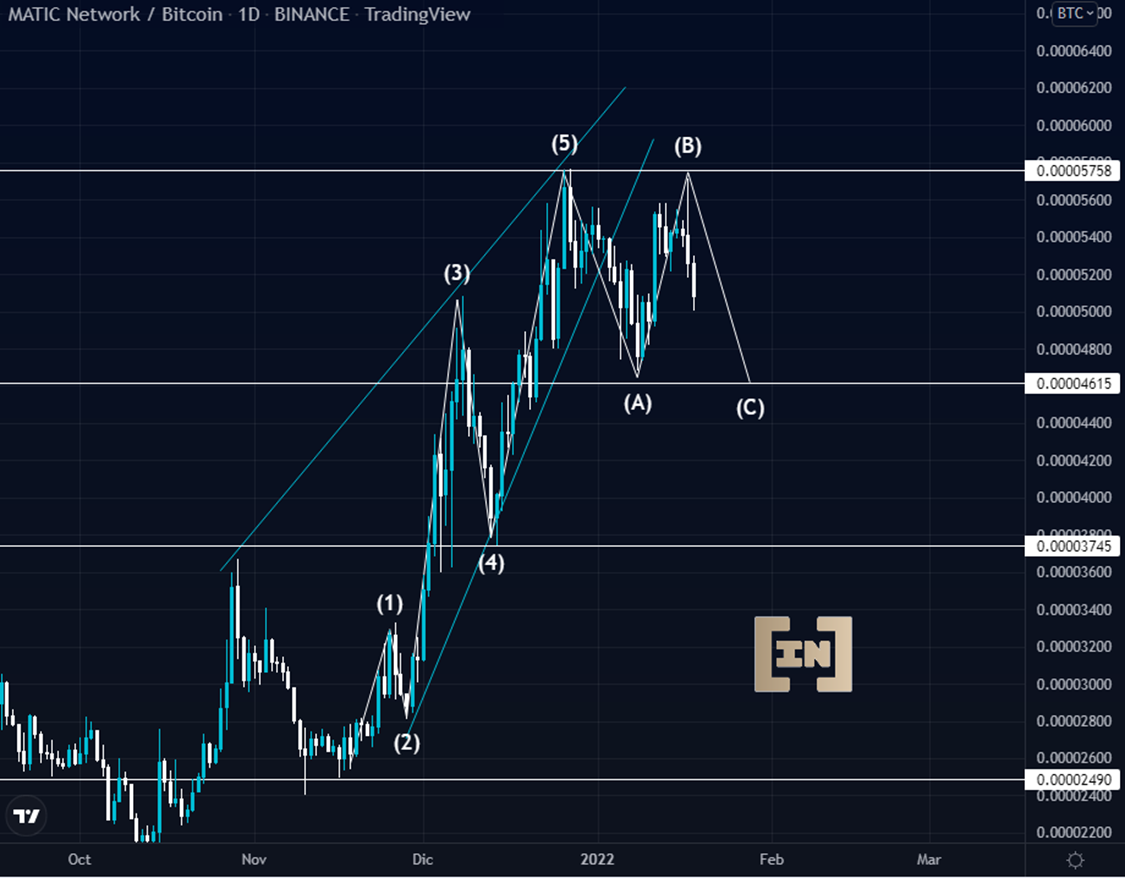 El precio de MATIC presenta un posible fin en su tendencia alcista, la octava onda y el soporte de los 0.000046 BTC será clave para un posible escenario bajista.