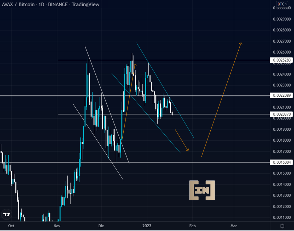 El precio de AVAX ha venido formando una segunda cuña bajista, por lo que su precio se comporta controlado y pausado frente a el par BTC.