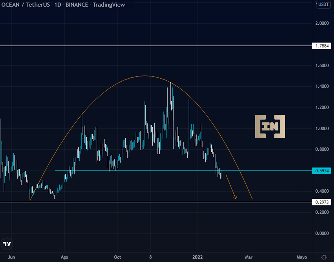 El precio de OCEAN ha perforado y confirmado la ruptura del área de soporte de los 0.597 dólares. También presenta la formación chartista de taza, por lo que en los próximos días puede continuar su descenso al soporte de los 0.3 dólares.