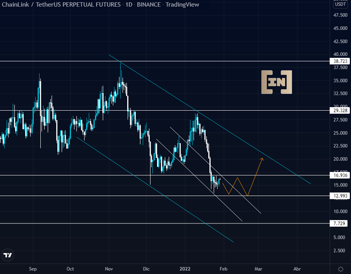 Como se puede apreciar en el grafico el precio de LINK a creado un gran canal descendente, se presentan dos escenarios para este activo.