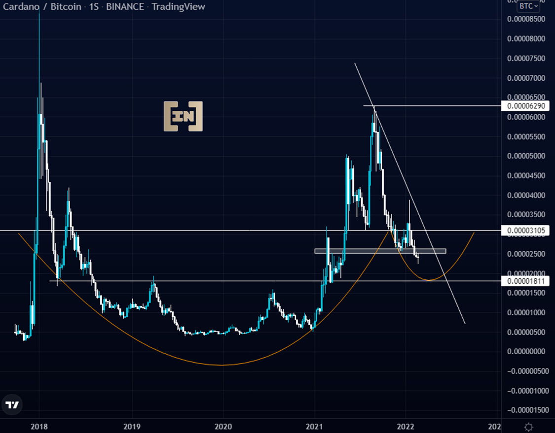 La cotización de ADA contra el par BTC presenta una formación de taza con posible asa en temporalidad semanal.