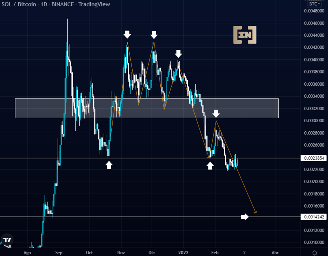 La cotización del precio de SOL contra el par BTC se encuentra en un rango lateral entre los 0.0022 BTC y 0.0024 BTC. Tras la ruptura sobre el área de soporte de los 0.0024 BTC se espera una continuidad descendente al soporte de los 0.0014 BTC.