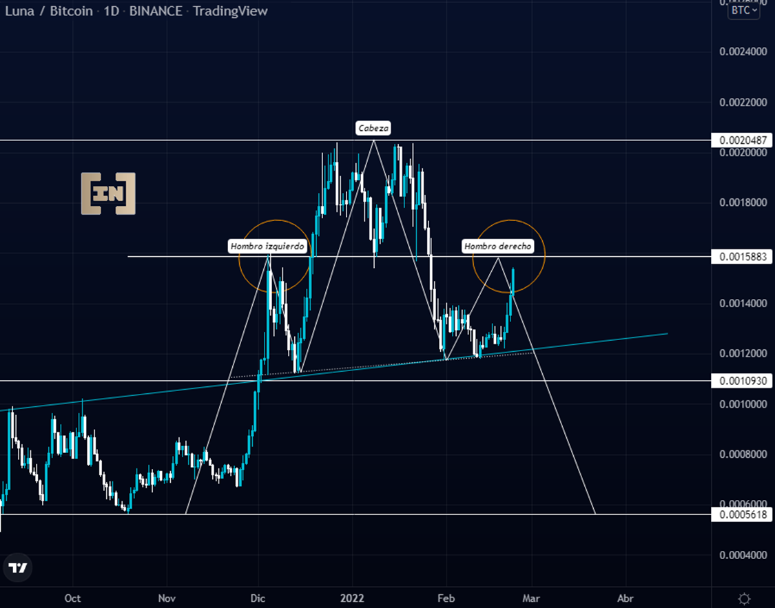 Para el precio de LUNA contra el par BTC presenta la posible formación del segundo hombro chartista, lo que se conoce como HCH, usando la zona de resistencia de los 0.0016 BTC.
