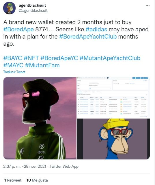 “Un nuevo creado hace 2 meses solo para comprar #BoredApe 8774 … Parece que #adidas pudo haber hecho un plan para el #BoredApeYachtClub [desde] hace meses”.