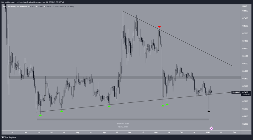 El 2 de enero, el precio de XRP pareció caer desde la línea de soporte después de 202 días. Sin embargo, creó una mecha inferior enormemente larga (icono negro) y recuperó la línea el mismo día. Esto se considera una señal alcista ya que los “osos” no tuvieron la fuerza suficiente para sostener la ruptura.