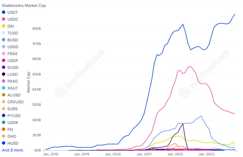 En julio de 2023, Tether ha experimentado un aumento del 36% en su capitalización de mercado. Sin embargo, USDC ha visto caer su capitalización de mercado por debajo de su capitalización de mercado de julio de 2023 de 27.000 millones de dólares, un mínimo de 5 meses.