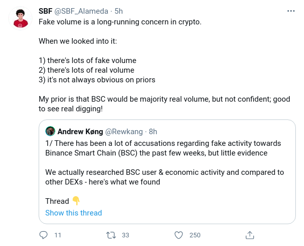 Varios investigadores del sector, incluido Andrew Kong (@Rewkang), han investigado a fondo las cifras tras varias acusaciones de volúmenes falsos asociados a Binance Smart Chain.