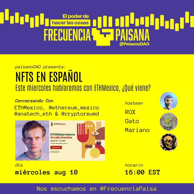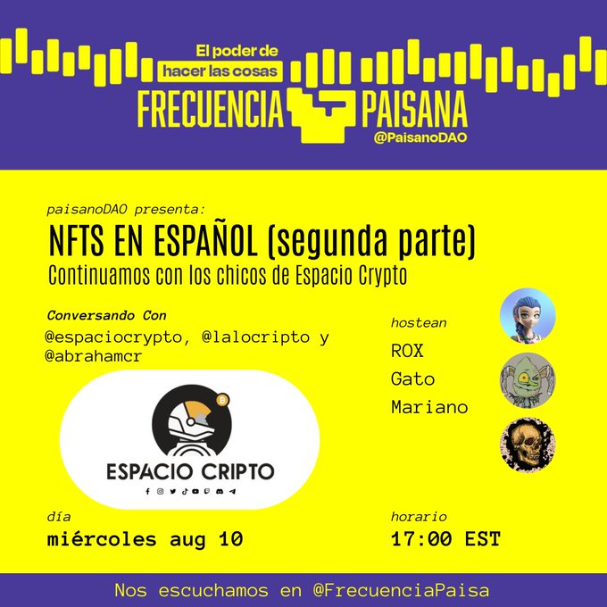 En este evento continuamos con los chicos de espacio cripto que continuaran la conversación de los NFT hispanos.
