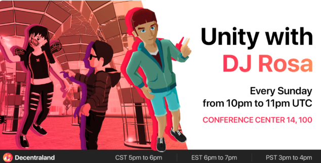 Fiesta en el metaverso con DJ Rosa, ven al metaverso y baila junto a la comunidad de Unity Café en el Decentraland Conference Center. En este lugar podrás conversar, bailar, hacer networking y aprender más de este metaverso mientras escuchas buena música.