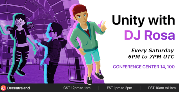 Fiesta en el metaverso con DJ Rosa, ven al metaverso y baila junto a la comunidad de Unity Café en el Decentraland Conference Center. En este lugar podrás conversar, bailar, hacer networking y aprender más de este metaverso mientras escuchas buena música.
