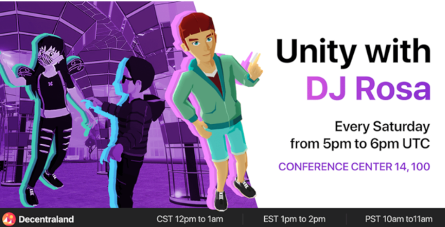 Fiesta en el metaverso, en el Unity Café en el Decentraland Conference Center. Un espacio erfecto para el networking y, aprender más sobre Decentraland y artistas NFT.