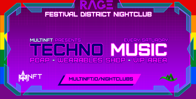 Prepárate para la mejor música del metaverso, nfts, wearables y más. RAGE NIGHTCLUB es un lugar moderno y disruptor de NIGHTCLUB en el famoso Metaverse Festival District. Un paraíso rave para los amantes de la música dance underground.