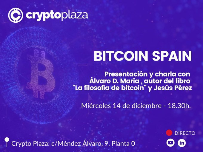 Este evento es la presentación del libro ‘La filosofía bitcoin’ y una charla con su autor @Alvaro_DMaria en Crypto Plaza.
