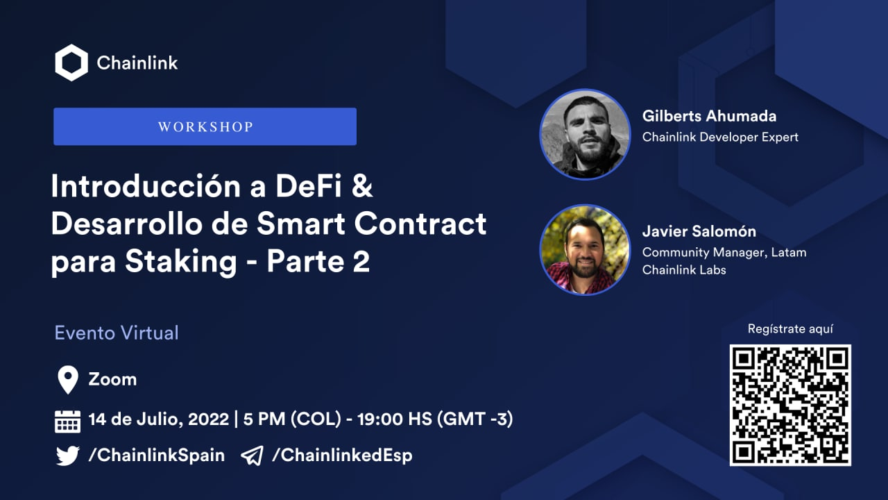 Para los que quieren construir, también el día 14 de julio, tendremos la Parte 2 del workshop: Introducción a DeFi, explicación y desarrollo de un contrato inteligente para Staking basado en el algoritmo de Synthetix.
