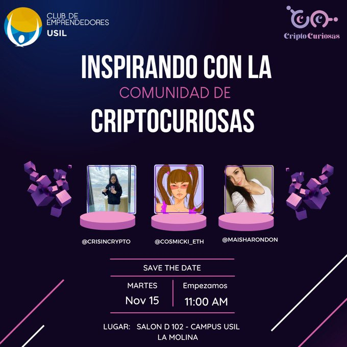 En este evento la comunidad peruana de @Criptocuriosas estará presentando su labor por el mundo cripto junto al Club de Emprendedores USIL.