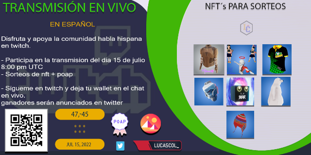 Disfruta y apoya la comunidad habla hispana en twitch para aprender de el metaverso Decentraland. Habrá sorteos de nft + poap para los participantes.