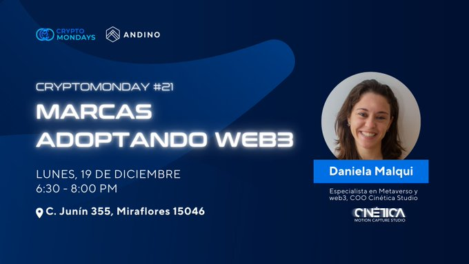 En este evento, Daniela Malqui, una especialista en metaverso y Web3 nos contará sobre su experiencia y análisis de marcas adoptando Web3 y los aprendizajes que podemos tomar de la implementación de la tecnología Web3 en marcas tradicionales.