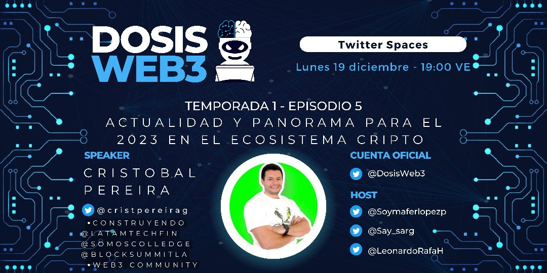 En este space contaremos con la experiencia de Cristobal Pereira, un miembro destacado de la comunidad web3 en LATAM y creador del @BlockchainSummitLA, @LatAmTechFin y @somoscolledge