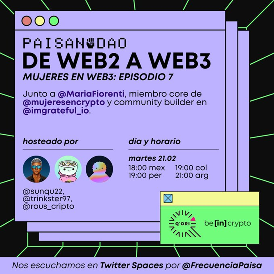 En este spaces, el popular host @sunqu22 de @qoriproject estará conversando con @trinkster como todos los martes junto a @MariaFiorenti, miembro core de @mujeresencrypto, una de las comunidades de mujeres más fuertes de LATAM.