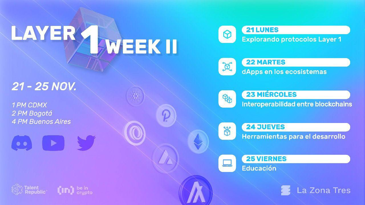 En este evento @lazonatres aprenderás todo lo que necesitas sobre Layer 1. Exploraremos los protocolos Layer 1 más conocidos, las DApps de estos ecosistemas, las soluciones de interoperabilidad y las herramientas para el desarrollo de esta tecnología.