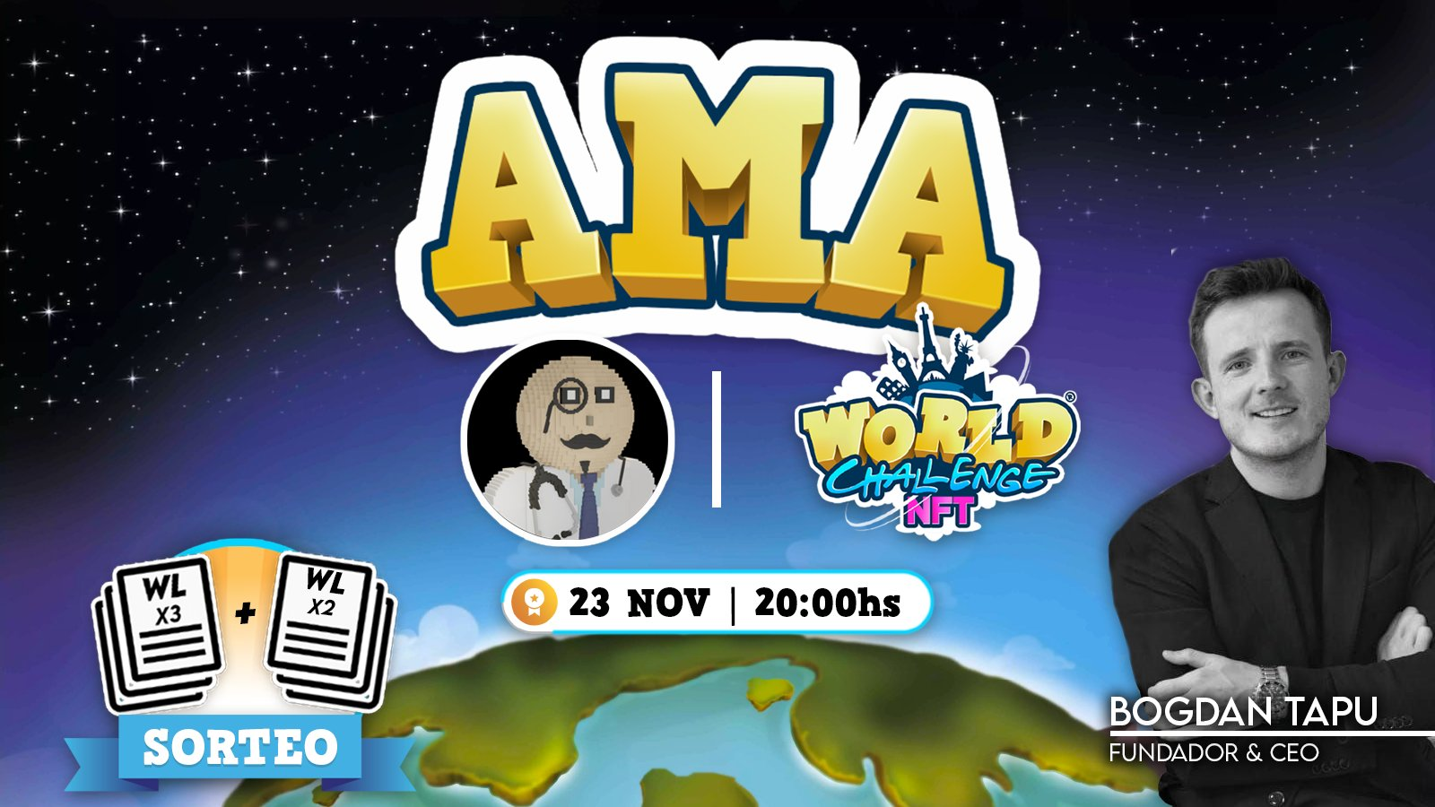En este evento podrás participar de un AMA con @BogdanTapu, el CEO y Fundador de @WorldChallengeG quien estará conversando junto a la comunidad de @DocpixelNFT.