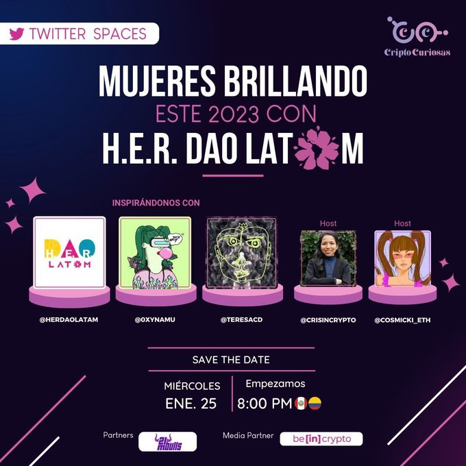 En este Twitter space se conversará con representantes de una de las DAO más grandes de mujeres y con mayor impacto en el mundo. Estará presente 0xNamu, @teresacd junto a las @criptocuriosas.