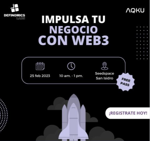 En este evento el grupo especializado de DefinomicsLabs junto a AQKU estarán compartiendo una capacitación personalizada sobre cómo impulsar tu negocio con web3.