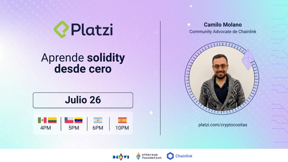 En este evento aprenderás uno de los lenguajes más conocidos en el espacio cripto junto al especialista Camilo Molano del equipo de Chainlink