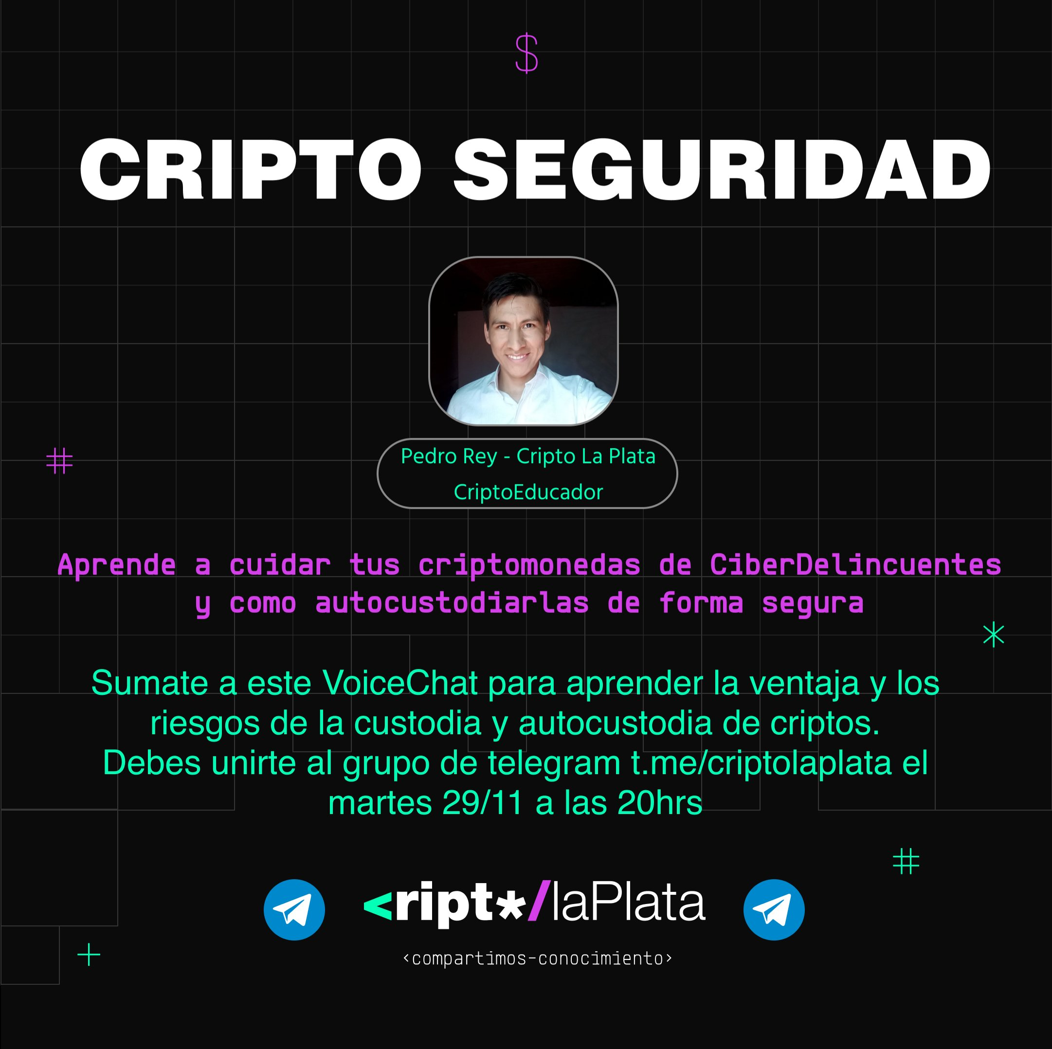 En este evento recibe los mejores tips del CriptoEducador Pedro Rey, quien te contará las mejores prácticas para autocustodiar tus criptomonedas de forma segura. Para participar de este evento debes unirte al grupo de Telegram t.me/criptoplata.