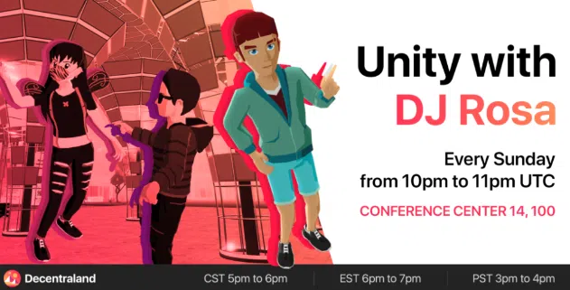 Fiesta en el metaverso con DJ Rosa, ven al metaverso y baila junto a la comunidad de Unity Café en el Decentraland Conference Center. En este lugar podrás conversar, bailar, hacer networking y aprender más de este metaverso mientras escuchas buena música.
